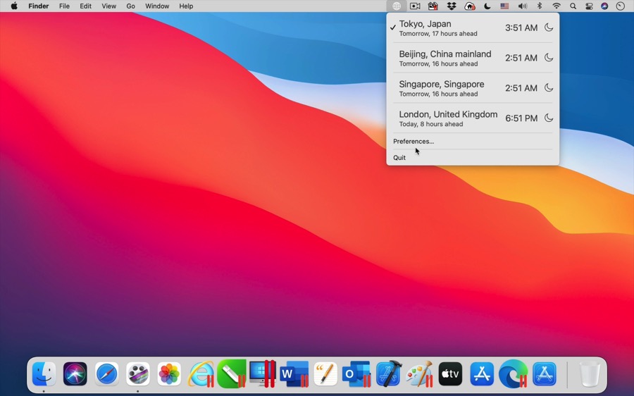 macOSSe lokal tid för städer runt om i världen direkt i menyfältet. Visar tidsskillnaden från din nuvarande plats samt en symbol för dag/natt för enkel referens.
